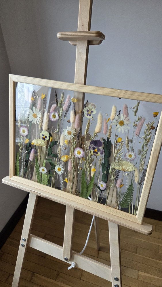 Интерьерное панно из сухоцветов без фона 30х40 см с ромашками и виолами, рама черного цвета